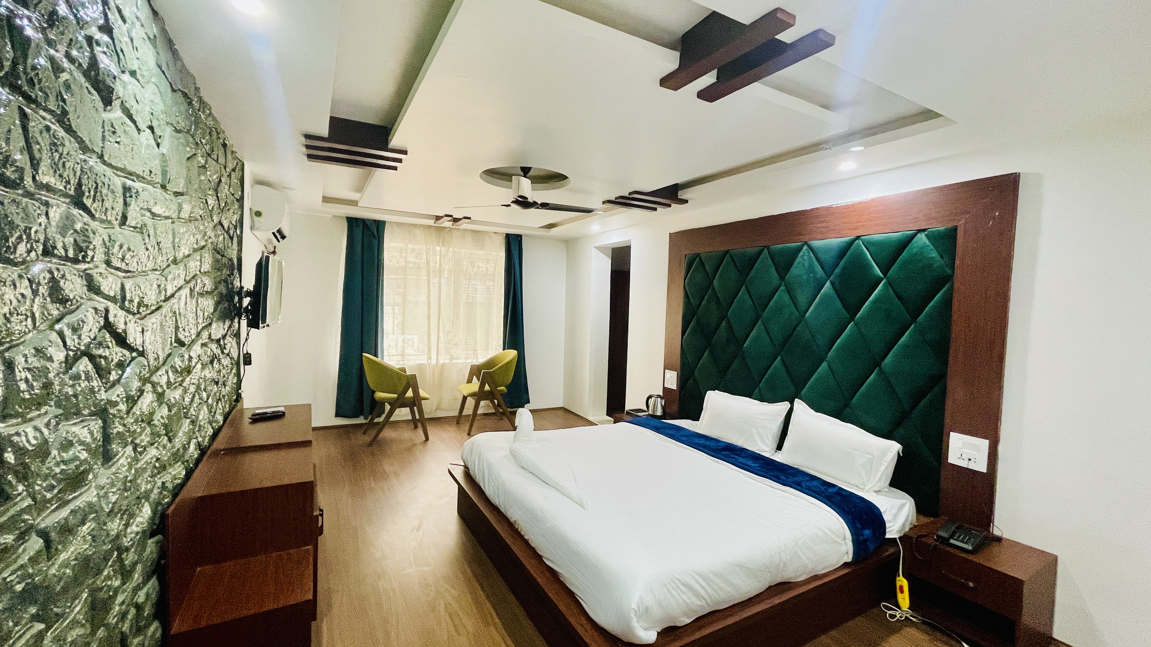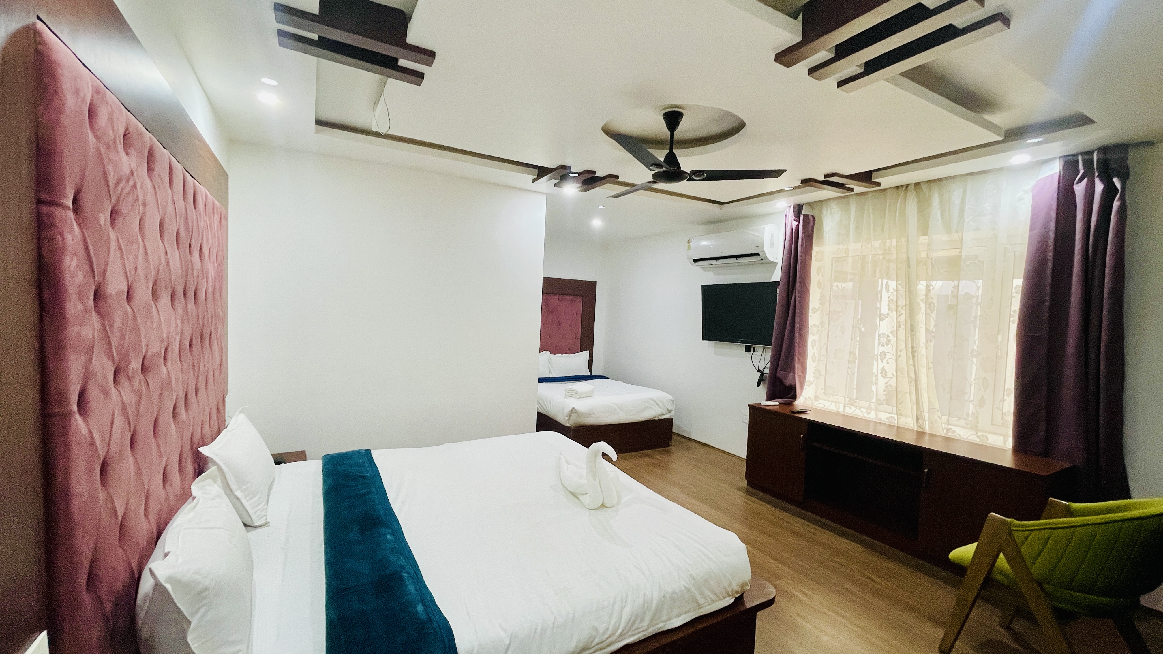 This spacious Family Suite is thoughtfully designed to provide comfort and convenience for families or groups traveling together. The room features two luxurious queen-sized beds, each adorned with soft bedding and elegant velvet headboards in soothing shades of pink and blue, adding a touch of warmth and style.This suite combines elegant aesthetics with thoughtful amenities, making it ideal for families seeking a relaxing and enjoyable stay.